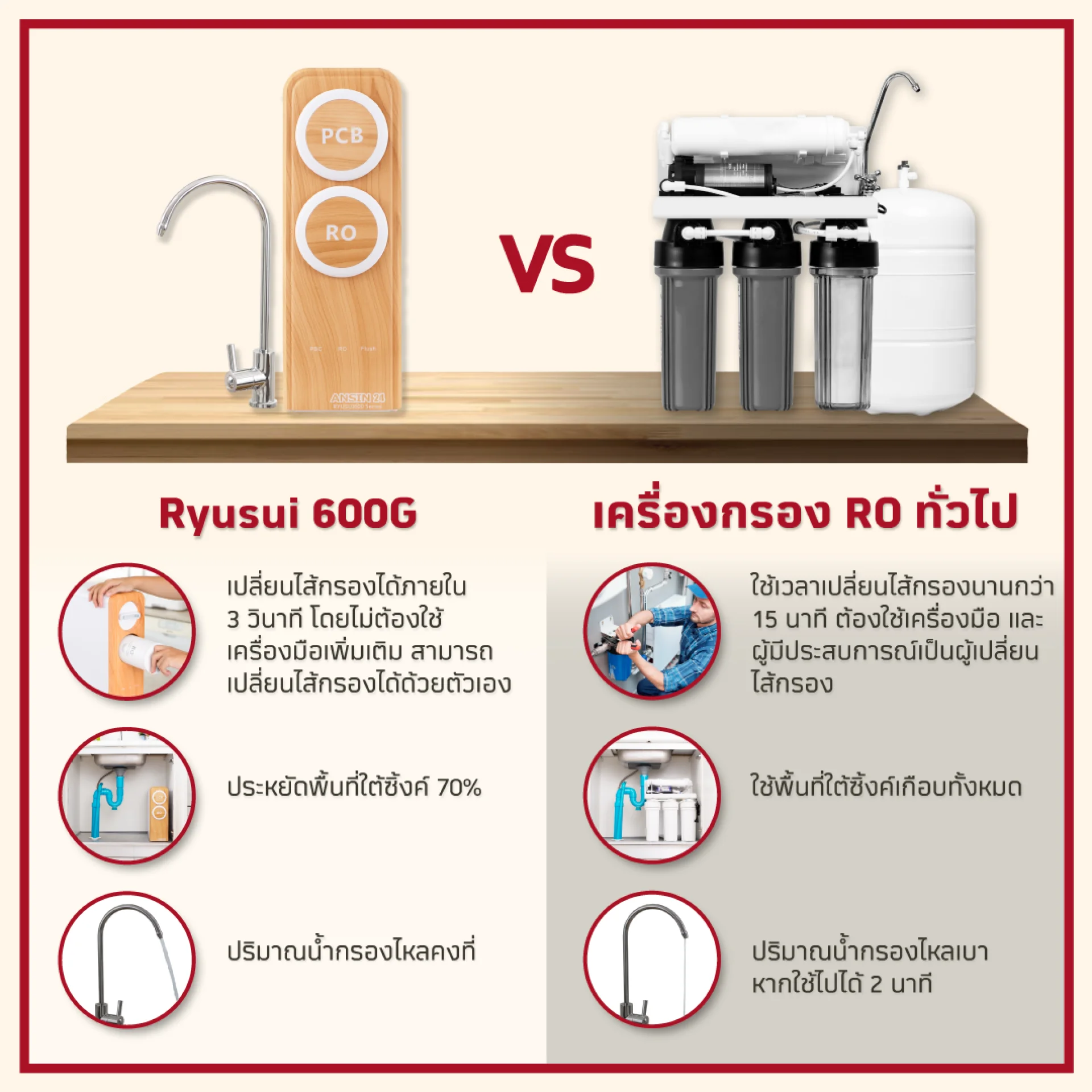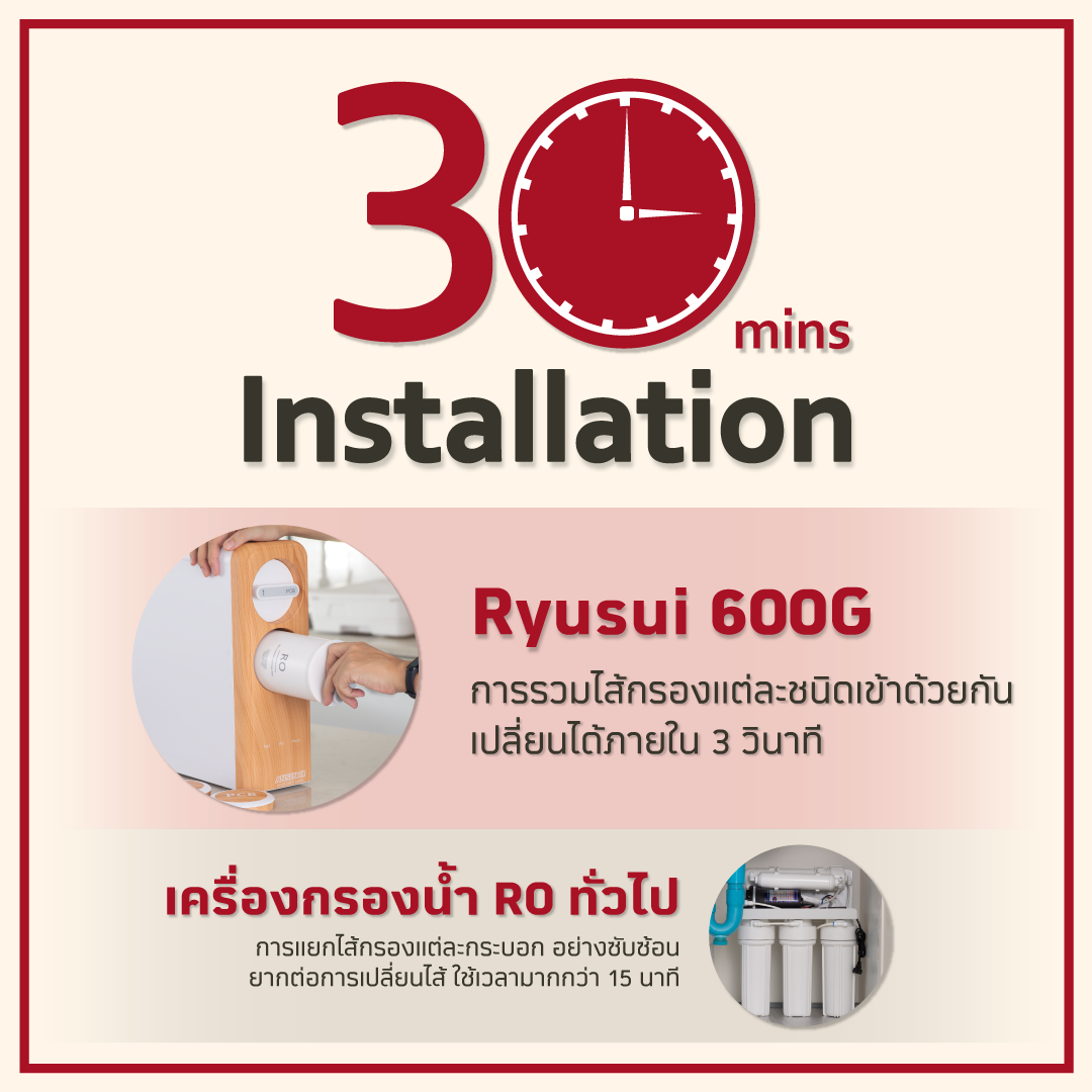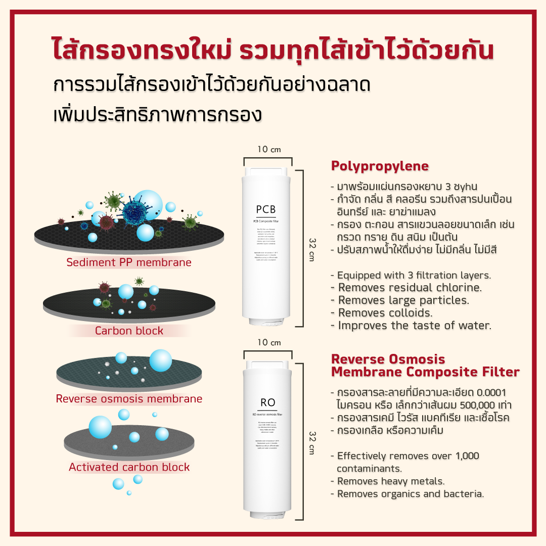 ใส้กรอง RO ที่ความละเอียดสูง 0.0001 ไมครอน ทำให้น้ำจากระบบ RO ปราศจากการจือปนของสารคมี และเศษซากสิ่งมีชีวิตในน้ำ